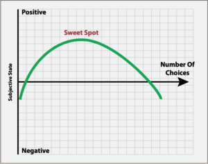 The opportunity cost of not choosing from an abundance of options. This is what I call analytical sacrifice, more commonly known as analysis paralysis. Having so many decisions that you end up either choosing poorly or not choosing at all. Not a fun cycle. Typically after a certain point (the high point/sweet spot on the graph), additional choices only add to discomfort.